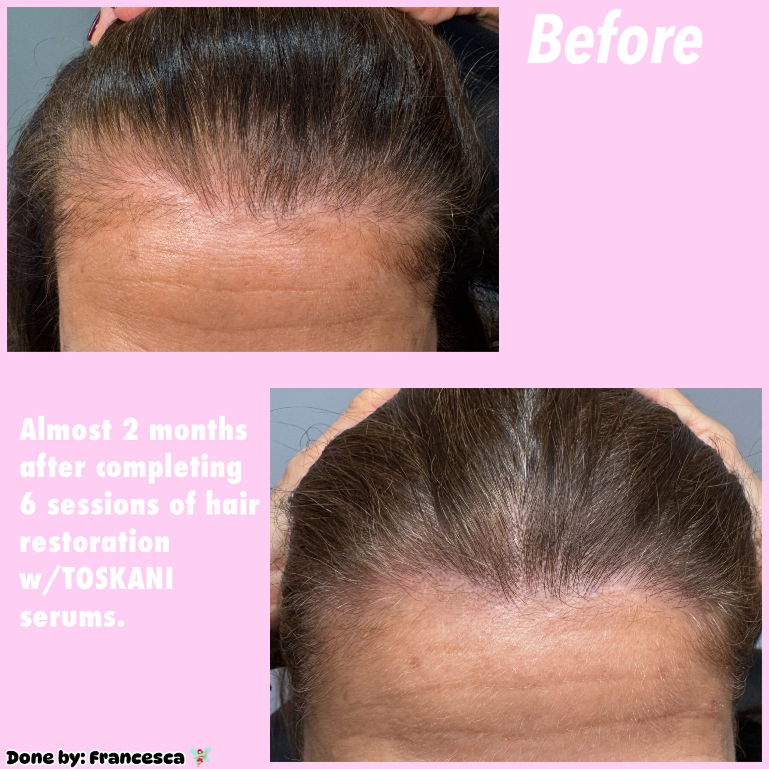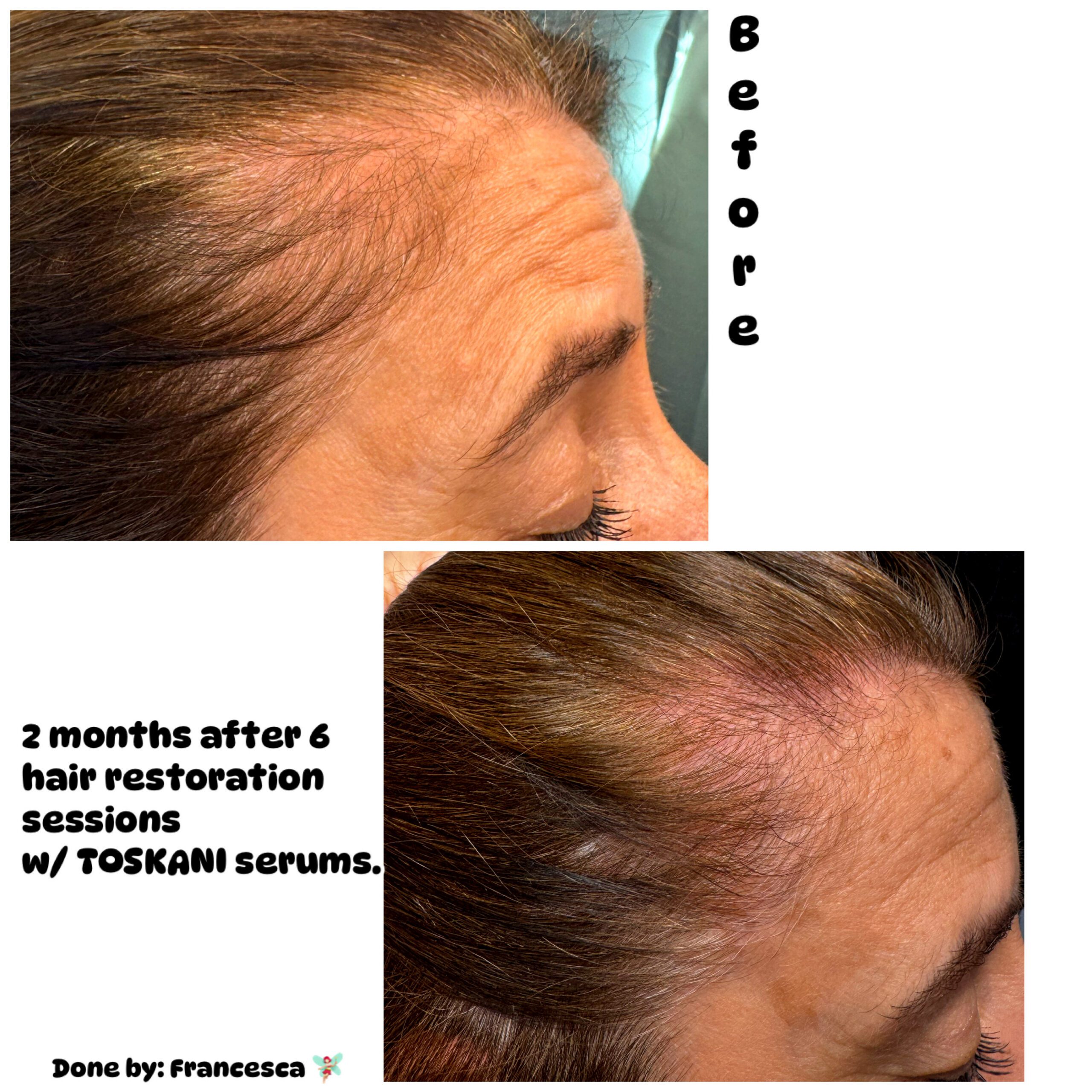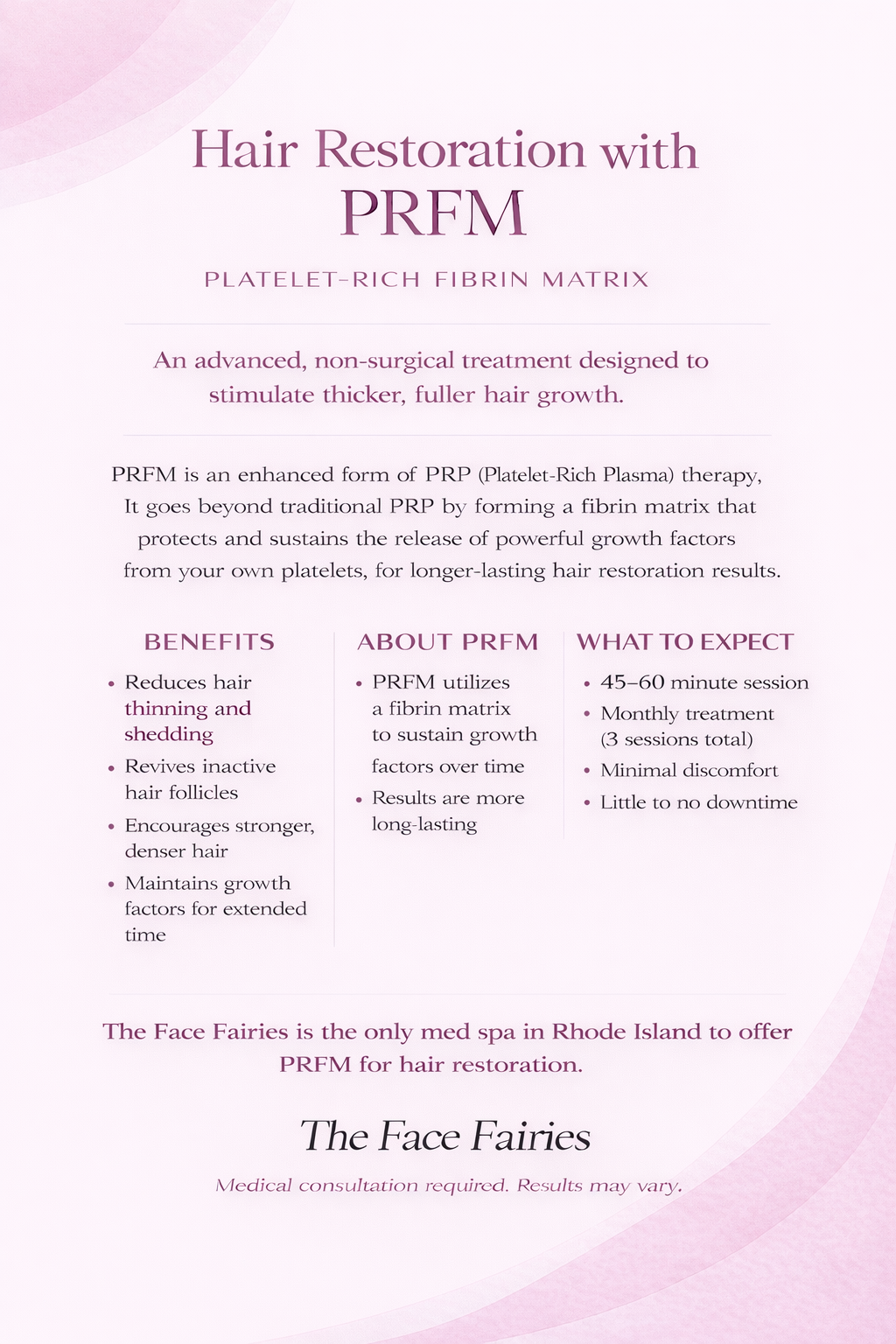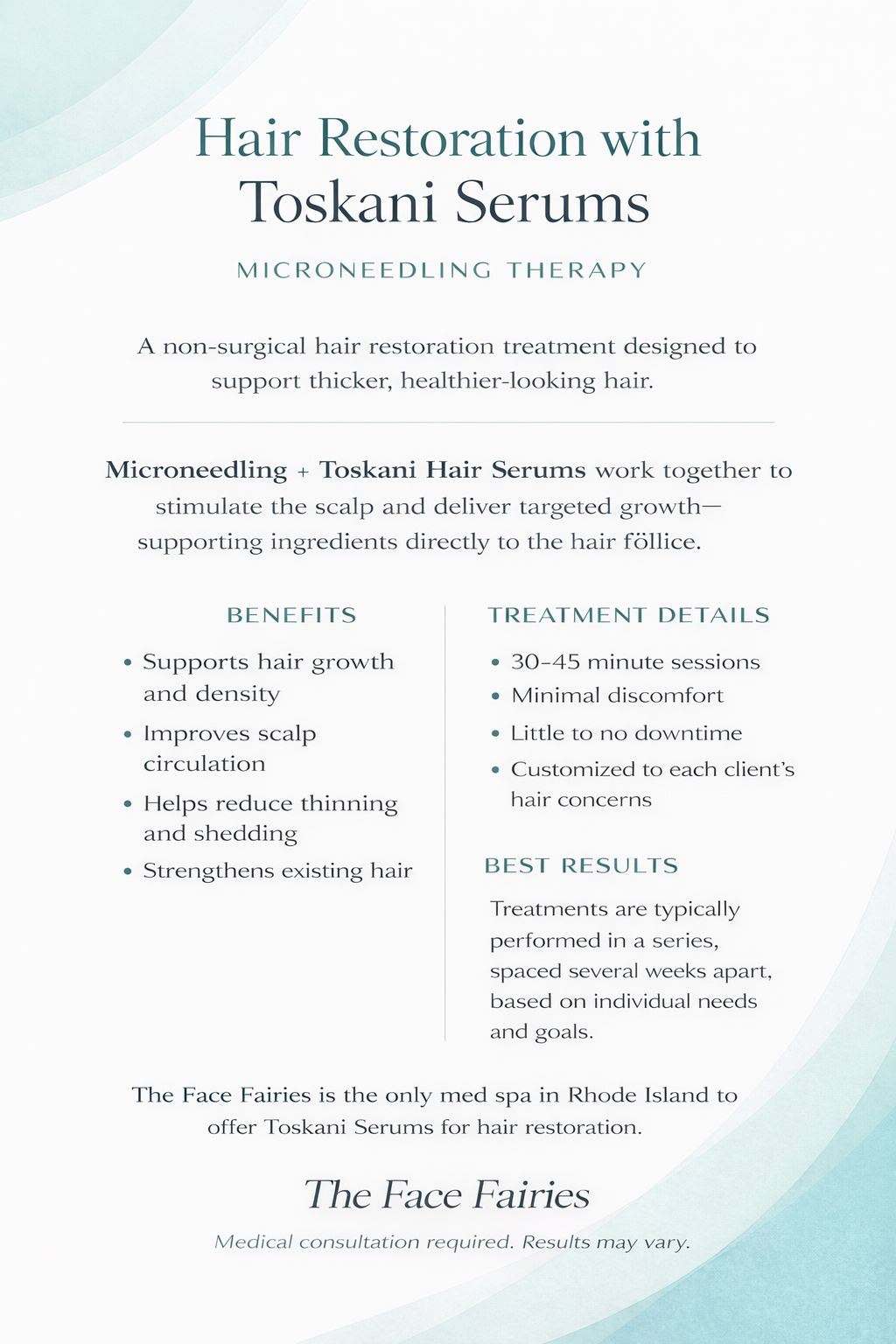 The Face Fairies is proud to be the only provider in Rhode Island offering Toskani serums combined with microneedling for hair restoration, delivering advanced scalp-first therapy designed to support hair density, strength, and overall scalp health. In addition, we offer PRFM (Platelet-Rich Fibrin Matrix) hair restoration, an innovative regenerative treatment that uses your body’s own growth factors to stimulate follicles and promote thicker, healthier hair growth.