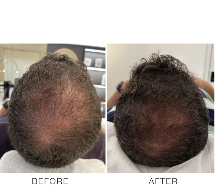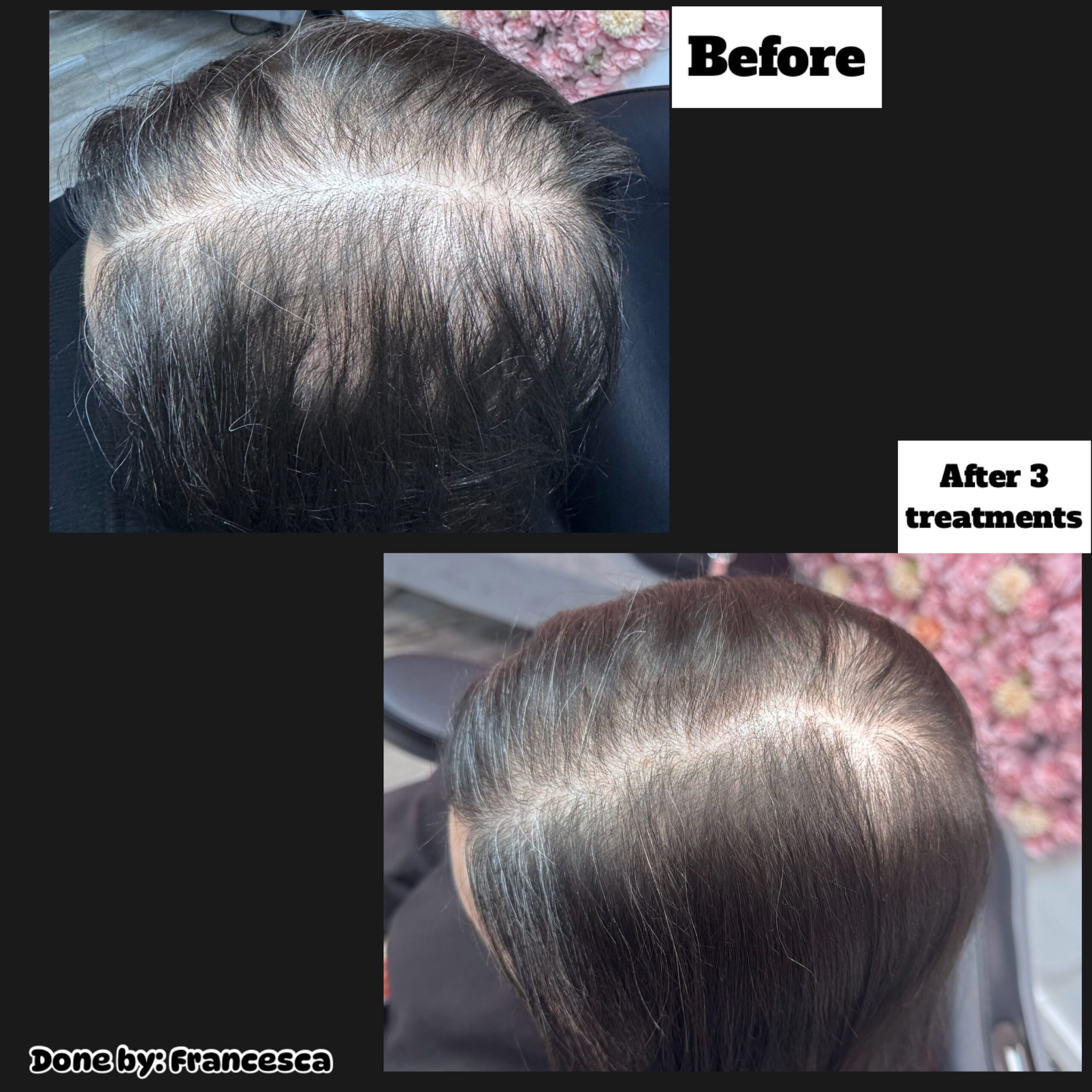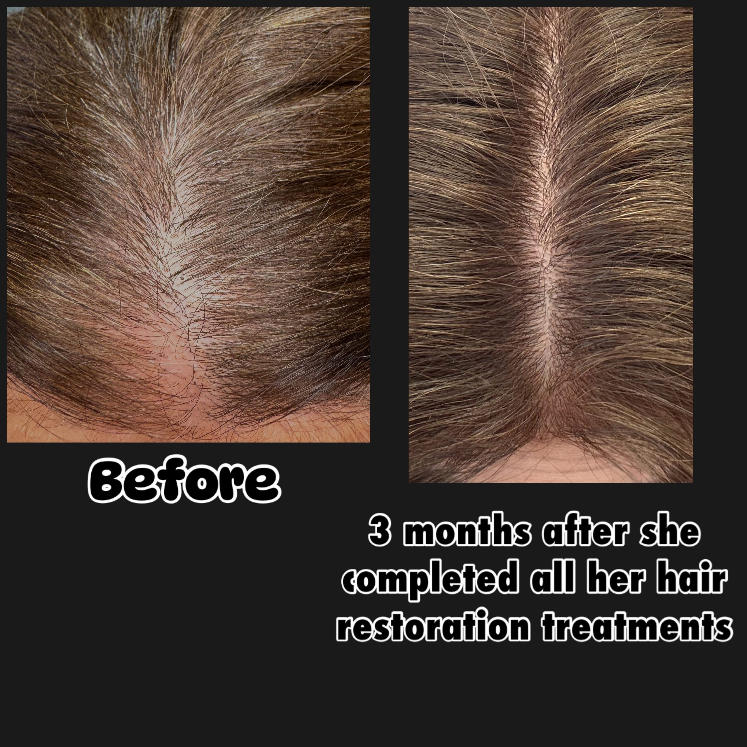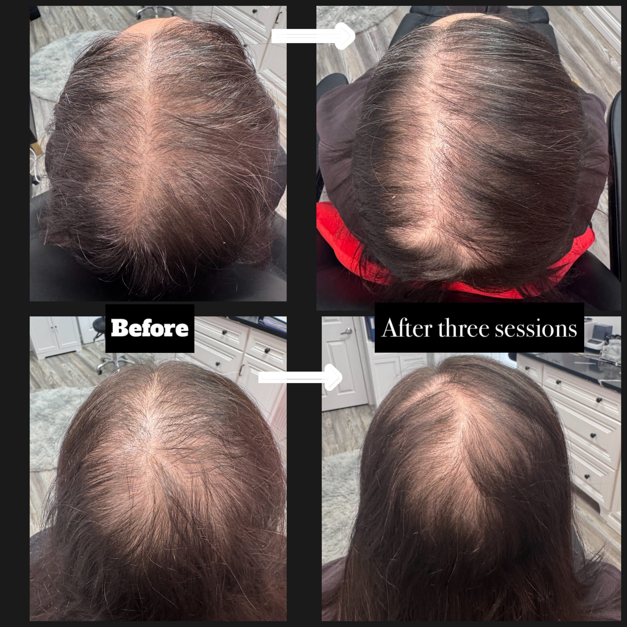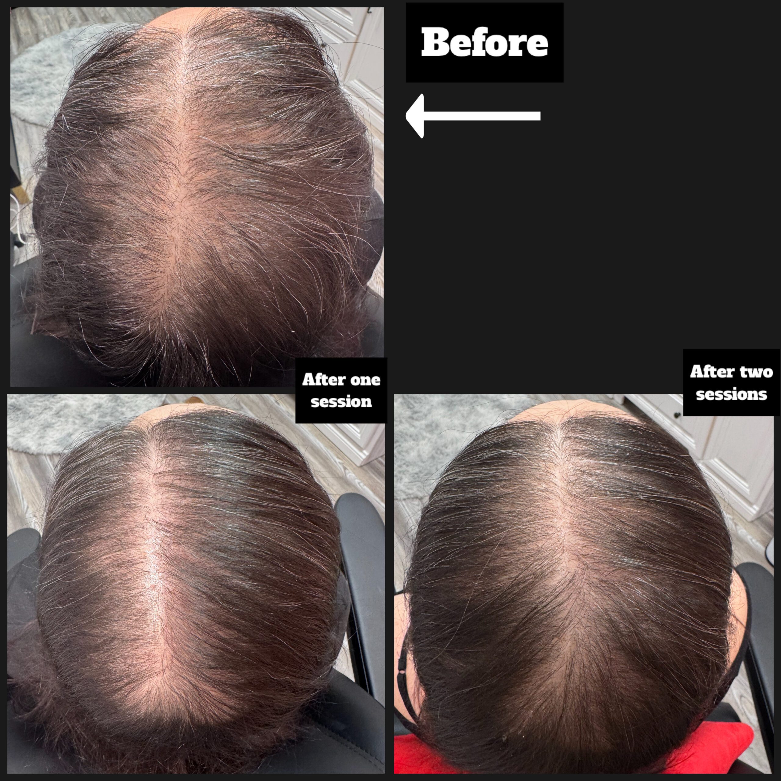 Most clients notice reduced shedding within weeks, with visible thickening around 8–12 weeks.